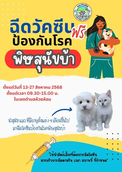 ประชาสัมพันธ์เชิญชวนประชาชนให้สุนัขและแมวของท่านรับบริการและฉีดวัคซีนป้องกันโรคพิษสุนัขบ้า